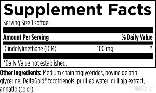 DIM-Evail™ provides 100 mg per softgel of diindolylmethane (DIM), a compound that helps support healthy estrogen metabolism.* Due to its crystalline structure, absorption of DIM is minimal when given orally. For this reason, DIM-Evail™ has been manufactured utilizing the Designs for Health’s Evail™ process, which improves the absorption of DIM. This process utilizes a proprietary blend of medium-chain triglycerides (MCT) oils, non-soy-derived lecithin, and tocotrienols, without the use of potentially harmful surfactants. Research tells us that a low-level of the 2-hydroxyestrone are not desired. DIM works by helping to increase the 2:16 hydroxyestrone ratio.*